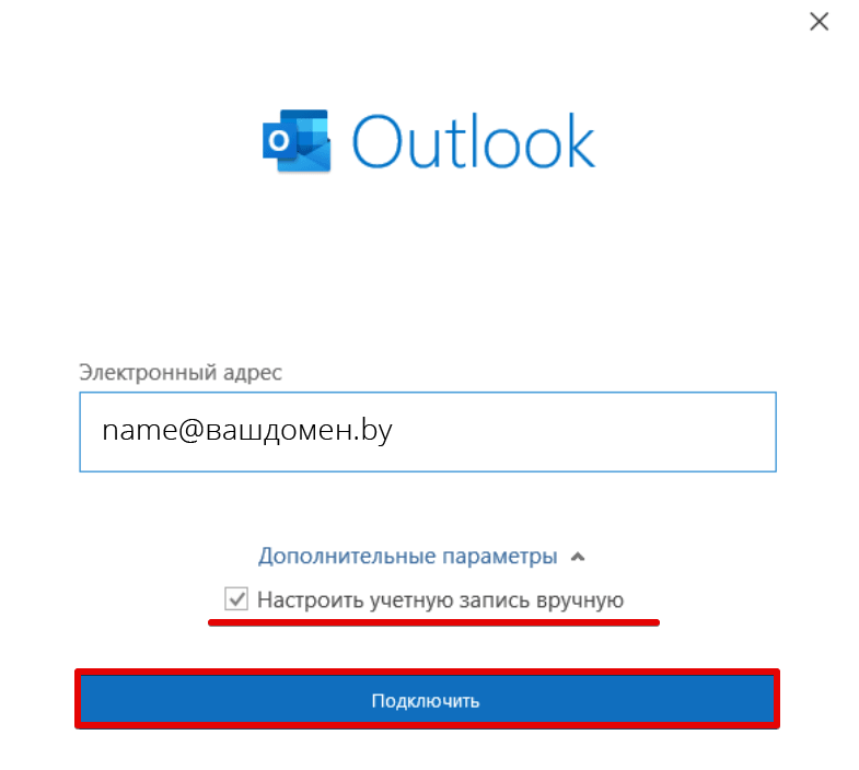 Введите ваш электронный адрес. Нажмите на Дополнительные параметры и поставите галочку напротив пункта Настроить учетную запись вручную. Нажмите Подключить: